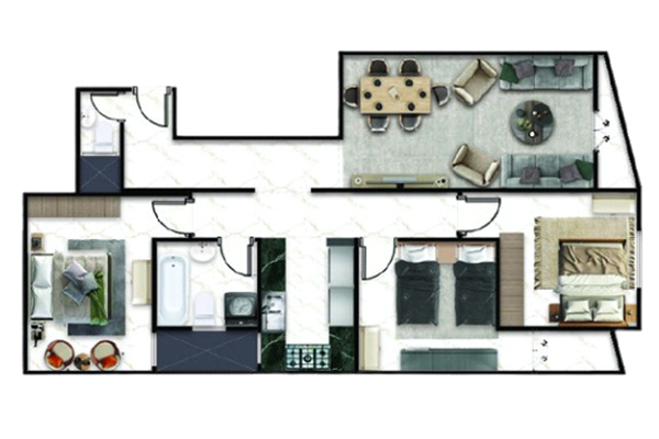 ⦁ حمام ضيوف 1*1.5 م⦁ استقبال ومعيشة 3.2*6.2 م⦁ غرفة نوم 3.2*3.4 م⦁ غرفة نوم 3.2*3.4 م⦁ مطبخ 2.3*3.2 م⦁ حمام 2.1*2.5 م⦁ غرفة نوم 3.1*4.3 م